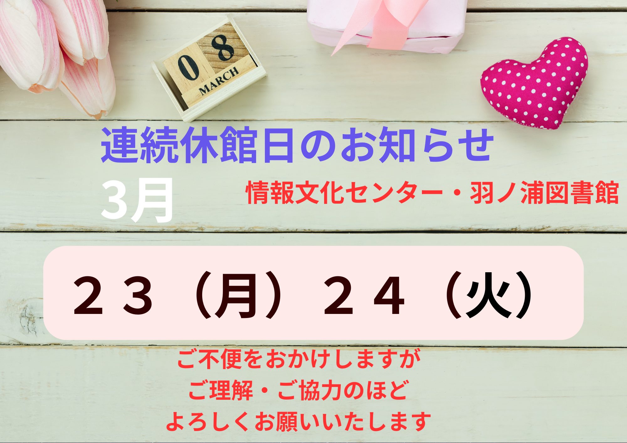 3月は、連続休館日がございます。