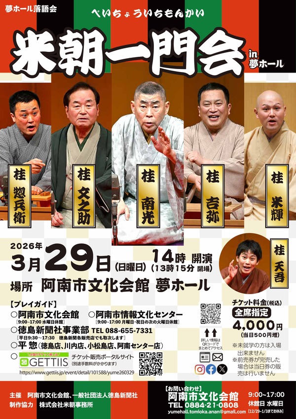 【プレイガイド】 夢ホール(阿南市文化会館) 阿南市情報文化センター 徳島新聞社事業部 平惣(徳島・川内・小松島・阿南センター店) GETTIIS 米朝一門会in夢ホール 2026/03/29(日) | チケット GETTIIS