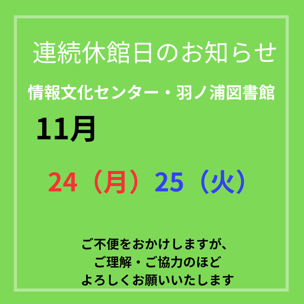 毎週月曜日と、祝日の次の火曜日は休館日です11月は、連続休館日が2回、ございます2回目の連続休館日☆